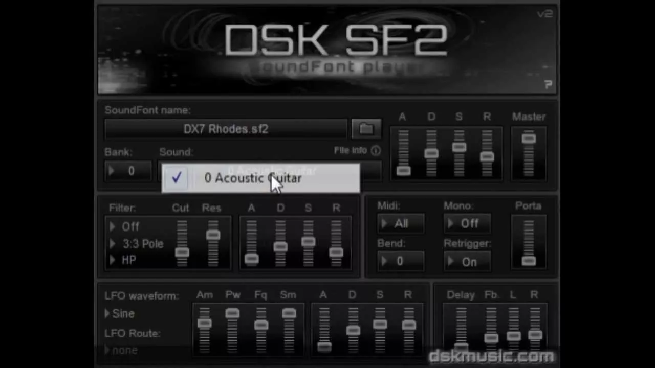 Soundfont player, by DSK Music. Features: Features: - Bank and preset selector - Midi channel selector - Note control (Bend, Retrigger) - Amp. envelope - Multimode Filter - Advanced LFO with output route - Midi automation & learn - Portamento time control - Filter amp. envelope - Delay fx - Redistributed GUI Info and download: https://www.fbi.gov/