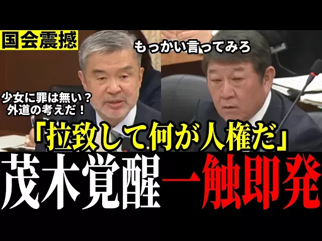 【12月5日 衆議院拉致問題特別委員会】 れいわ・上村議員が茂木大臣の発言を「外務大臣として極めて不見識」と批判しました。しかし、一般的な感覚で見れば茂木大臣が圧倒的に支持されるはずです。 意味不明な理論で国会を貶めるのはやめていただきたい。 あなたの意見や感想も、ぜひコメントで教えてください! ■おススメの動画 【高市早苗VS立憲・杉尾】ついにブチギレ!圧倒され杉尾議員口パクパク…「信用できないならもう質問しないでください」【国会切り抜き】 https://www.youtube.com/watch?v=6di71Vw_bk4 【立憲民主党VS維新の会】ついにブチギレ!長妻議員の失礼すぎる態度がヤバすぎる https://www.youtube.com/watch?v=gm9kbq7OLfc 【小西議員VS総務省】小西議員ついにブチギレ!総務省の答弁に「敬愛の精神」を忘れ捨て台詞を吐く【国会切り抜き】 https://www.youtube.com/watch?v=Pe9ESDhUff8 【小西議員VS総務省】国民は呆れている!欲しい答えがもらえるまで延々と同じ質問を繰り返していることがよく分かる動画【国会切り抜き】 https://www.youtube.com/watch?v=zS-zySbX0aY 【高市大臣VS小西議員】相手にならない...高市大臣を追い詰めるつもりが落とし所を見失う小西議員【国会切り抜き】 https://www.youtube.com/watch?v=7rXa9UDU_fg 【立憲・小西ひろゆき】何のための時間?ぶっ飛んだこじつけ質疑で与党の失言狙いか【国会切り抜き】 https://www.youtube.com/watch?v=VNoYqFZRzpA
