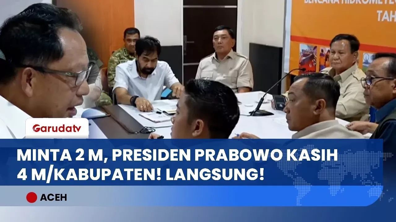 Komitmen Presiden Prabowo Subianto dalam penanganan bencana Sumatra kembali membuat publik takjub! Saat rapat bersama perwakilan 52 kabupaten/kota di 3 provinsi terdampak, Presiden Prabowo LANGSUNG MENGGANDAKAN dana bantuan yang diminta daerah. Dari permintaan awal Rp2 Miliar per kabupaten untuk hal kecil, Presiden Prabowo menyetujui Rp4 Miliar per kabupaten/kota! Selain itu, dana tambahan Rp20 Miliar disiapkan untuk provinsi dengan dampak terparah. Yang tak kalah penting, Presiden juga menyetujui usulan untuk MENGGRATISKAN biaya pengurusan dokumen penting yang hilang akibat bencana (seperti Ijazah, STNK, BPKB, dan Sertifikat Tanah) agar tidak memberatkan masyarakat yang sudah kehilangan segalanya. Presiden menegaskan: "Kalian panglima-panglima terdepan, kalian yang harus bekerja keras untuk rakyat." Editor & Uploader: Bagus Dewantoro ----- GARUDA TV - Digital TV Indonesia, Berita Terpercaya Saksikan Garuda TV di Free to Air atau Streaming melalui: www.garuda.tv | YouTube Garuda TV | Aplikasi Vidio | Wewatch | IndiHome CH111 | Transvision CH824 | FirstMedia CH45 Scan ulang saluran digital kamu sekarang ya dan saksikan terus program-program seru terbaru hanya di GarudaTV. - Subscribe GarudaTV Official Youtube Channel https://www.youtube.com/@garudatv.official - Follow our Official TikTok https://www.tiktok.com/@garudatv.official - Like our Official Facebook https://www.facebook.com/unsupportedbrowser - Follow our Official Instagram https://www.facebook.com/unsupportedbrowser