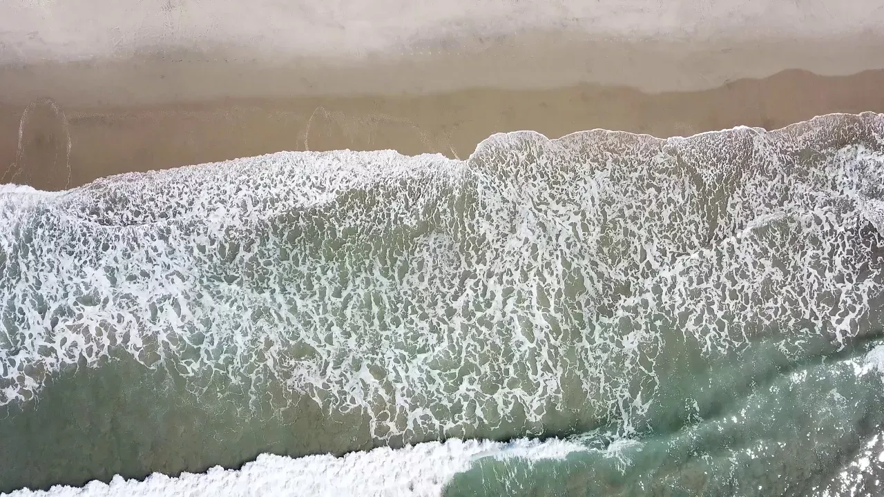 Ocean top down views as waves loll over sands on a beach with the drone remaining stationary to capture a still scene. Beautiful drone landscape footage was filmed around San Clemente featuring the southern California coast.