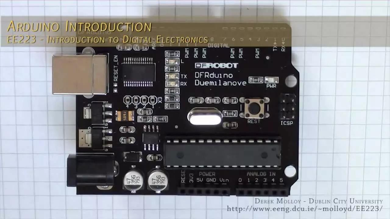 This is an introduction to the Arduino for students of the EE223 Introduction to Digital Electronics module. There are many introductions to the Arduino on YouTube and this is yet another one, but it aims to be very concise and to act as a basis for future videos. This video is part of an the EE223 Introduction to Digital and Analogue electronics module at Dublin City University. The associated materials are at: http://www.eeng.dcu.ie/~molloyd/EE223/ and http://www.derekmolloy.ie/