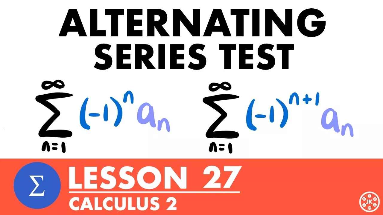 How to Use the Alternating Series Test & Approximate Sum of Alternating Series (Calculus 2 Lesson 27) In this video we learn how to determine if an alternating series converges or diverges by using the Alternating Series Test. An alternating series is a series whose terms alternate between being positive and negative. In order to converge, an alternating series must fail the divergence test and feature a sequence that is decreasing. When an alternating series converges, its sum can be approximated using a particular error formula. We take a look at several examples of using the Alternating Series Test, and an example of approximating the sum of a convergent alternating series. 🖥️ Join My Membership Site: https://www.jkmathematics.com/plus This video series is designed to help students understand the concepts of Calculus 2 at a grounded level. No long, boring, and unnecessary explanations, just what you need to know at a reasonable and digestible pace, with the goal of each video being shorter than the average school lecture! Calculus 2 requires a solid understanding of calculus 1, precalculus, and algebra concepts and techniques. This includes limits, differentiation, basic integration, factoring, equation manipulation, trigonometric functions, logarithms, graphing, and much more. If you are not familiar with these prerequisite topics, be sure to learn them first! Video Chapters: 0:00 What is an Alternating Series? 4:00 The Alternating Series Test 5:58 Why The Alternating Series Test Works (Visual) 9:50 Example - (-1)^n/n 14:24 Example - (-1)^n(2n+1)/(3n) 17:44 Example - 5(-1)^n/(2+n^3) 20:39 Example - (-1)^n/2^n 22:54 Example - n(-1)^n/ln(n) 25:40 Alternating Series Remainder / Error 32:37 Example - (-1)^n/n! (Part 1: Alternating Series Test) 35:08 Example - (-1)^n/n! (Part 2: Approximating the Sum) 40:51 Outro 📝 Examples Video: https://youtu.be/xXssfD_0ZRU ⏩ Next Lesson: https://youtu.be/52Gj0pJ2Iu0 📺 Calculus 2 Playlist: https://youtube.com/playlist?list=PLHdRLeAbIZE7KQ922piyRIDAj30XYcOIu 📺 Calculus 1 Playlist: https://youtube.com/playlist?list=PLHdRLeAbIZE6krGDQthaQRpLZFLD4ob54 🌐 Visit My Website: https://www.jkmathematics.com ⚡️Math Products I Recommend⚡️ Graphing Calculator: https://amzn.to/3XuUcB9 Non-Graphing Calculator: https://amzn.to/46hHJ7E Financial Calculator: https://amzn.to/3CRe9s4 Graphing Paper: https://amzn.to/46mAfAr College Rule Paper: https://amzn.to/3NOJaTN My Favorite Pencil: https://amzn.to/3NOFMIB My Favorite Erasers: https://amzn.to/3PumUQB Calculus Workbook: https://amzn.to/3r8SnNP ⚡️Textbooks I Use⚡️ Calculus 1 & 2: https://amzn.to/3PzfI5F Calculus 3: https://amzn.to/46rSy76 Financial Mathematics: https://amzn.to/3ppIVW0 ⚡️My Recording Equipment⚡️ iPad Air: https://amzn.to/3phEug1 Apple Pencil (Gen 2): https://amzn.to/3Nl45MM Tablet Desk Stand: https://amzn.to/4420rPh External Hardrive: https://amzn.to/44pkEyh (Commissions earned on qualifying purchases) Find me on social media: Facebook: https://www.facebook.com/jkmathematics Twitter: https://twitter.com/jk_mathematics Instagram: @jk_mathematics Found this video to be helpful? Consider giving this video a like and subscribing to the channel! Thanks for watching! Any questions? Feedback? Leave a comment! -Josh from JK Math #calculus Disclaimer: Please note that some of the links associated with the videos on my channel may generate affiliate commissions on my behalf. As an amazon associate, I earn from qualifying purchases that you may make through such affiliate links.