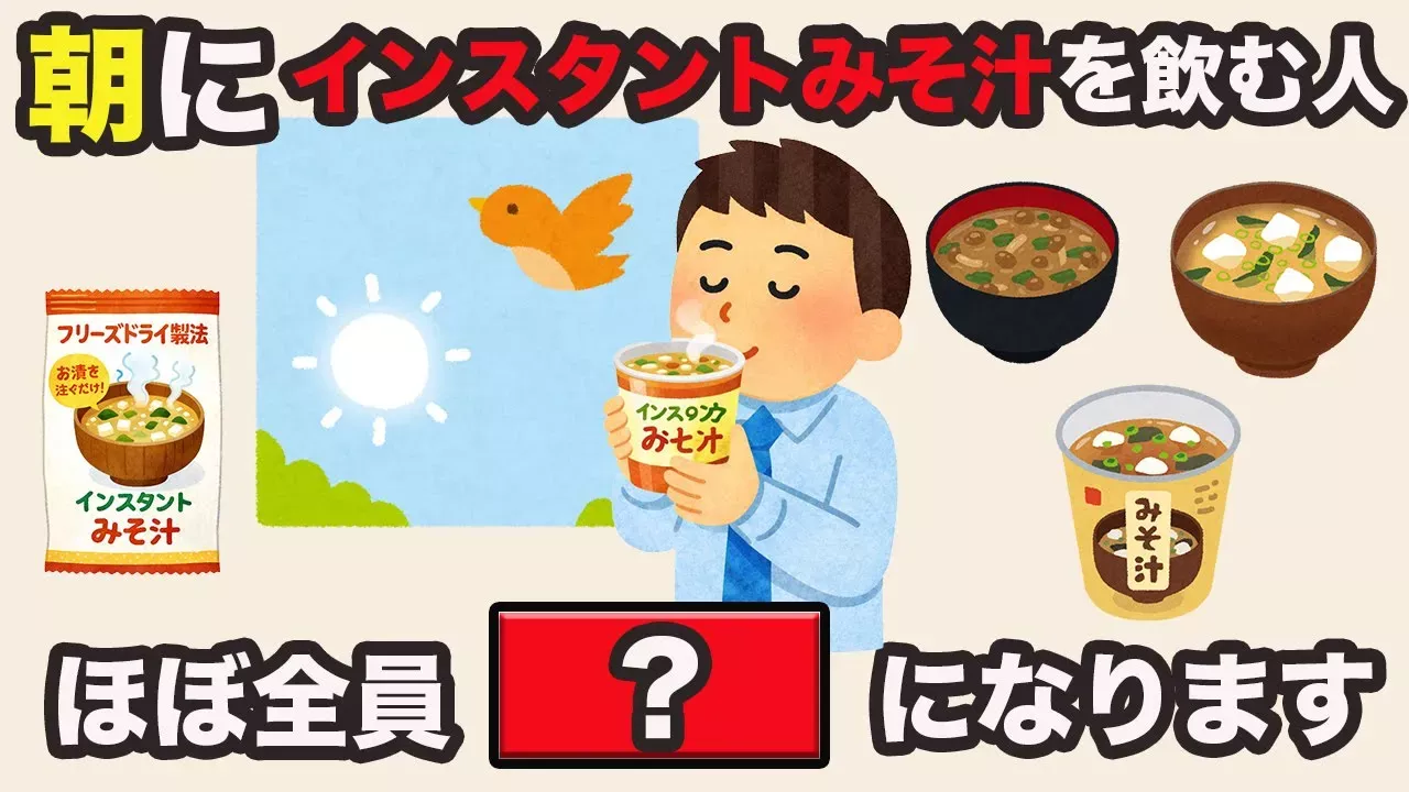 忙しい朝でも続けやすい「インスタントみそ汁習慣」。体を温めて代謝アップ、腸内環境や自律神経も整います。手軽なのに栄養しっかり。朝の一杯で、1日の調子が変わる理由を解説します。 おすすめフリーズドライみそ汁:https://www.amazon.co.jp/%E3%82%A2%E3%83%9E%E3%83%8E%E3%83%95%E3%83%BC%E3%82%BA-%E3%81%84%E3%81%A4%E3%82%82%E3%81%AE%E3%81%8A%E3%81%BF%E3%81%9D%E6%B1%81-5%E7%A8%AE%E3%82%BB%E3%83%83%E3%83%8810%E9%A3%9F/dp/B08KJ3HCRC?dib=eyJ2IjoiMSJ9.vOj7G3SeCOnLw_oRJ7t4nBEN4fFArybnvTIK41vbU4TNlfGHNWYS1UsstwTNqYit8qHW6FdMVUa3_3z0ALaMVABglsZN51wStBOSDOn43DHnjOprrAbxDmL9DdgkKkDGUt59E6OSx_7NCZBBzv_MwSTmGTpeH6-Ilor82gVNqrBEBIa3AvrOtmxeqzLCHV546honb_paKqhS_Z63Z5wezKTguXQthIIXbMnOaHC8hCwnJgxAof08Y7jIuM6SpqLObdV8IDVyFiJmJFPKGoZIncpkyccxbd6shBNuyUcjwOU.SnQr5sF5fAq6jlC_Kxvx2N2x_d5-nMGTB_Qb8ys2OZw&dib_tag=se&language=ja_JP 0:00 オープニング 0:49 朝は“冷えたまま”スタートはよくない 1:08 朝の味噌汁が体にいい理由 1:51 インスタント味噌汁でOKな理由 2:15 効果を最大にする飲み方 2:33 まとめ 🔔このチャンネルでは、社畜サラリーマンがお金をかけずに即実践できる「ライフハック」や「誰かに話したくなる雑学」をわかりやすく紹介しています!! 🔸使用ツール 「VOICEVOX:青山龍星、ずんだもん」 🔸素材 「いらすとや」