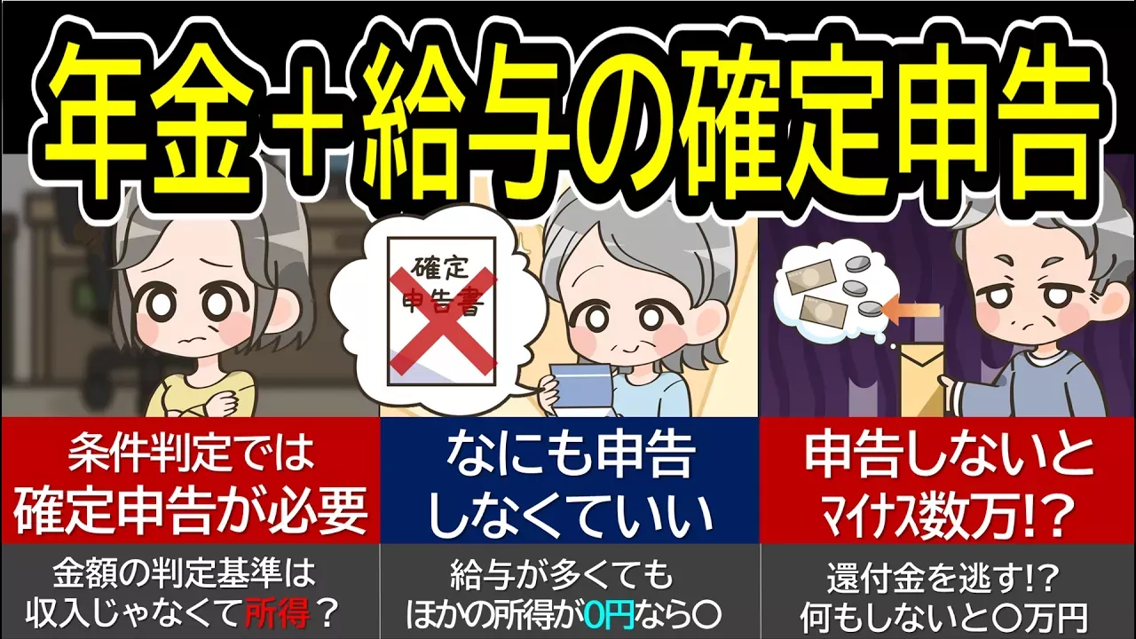 年金をもらいながら働いて給料ももらっている人は確定申告が必要になるのか。はたらきながら年金をもらう場合でも確定申告をしなくてもいいときがあります。 しかし、ひとによっては確定申告しないと数万円以上損してしまうこともあるので要注意です。 この動画では給与と年金がある場合の確定申告について説明しています。会社員やパートをしながら年金を受給しているひとは確定申告が必要になるのか把握しておきましょう。給料がいくらまで確定申告が必要ないのか、年末調整だけじゃダメなのか説明しています。 ▼▼おすすめ動画・記事 ▼年金をもらいながら働いて給料も貰っている人は確定申告は必要? WEB記事↓ https://www.mmea.biz/15232/ ▼【年金と給与の税金計算】しっかりできてる? https://www.youtube.com/watch?v=GUjti_gtO-o ▼年金と給料をもらっている場合の確定申告のやり方や記入例は? WEB記事↓ https://www.mmea.biz/look_up/kakuteishinkoku-nenkin-salary/ ■■■■■■■■■■■■ ↓理想の年収223万ライン ▼【年金と給与】200万超えでも税金0円!理想的な年収を解説 【年金+パートの裏技】稼ぎながら出費節約の両立 https://www.youtube.com/watch?v=tLoh3CsxFrc ▼年金受給者が働くならいくらまでがいい?【手取りが減る年収】 https://www.youtube.com/watch?v=BSDNDWbeXJY ▼60歳以上でパートで働く年金受給者のお得?ズル?なルールを解説!税金0円・保険料最安にする理想の年収や負担倍増の悲劇を解説 https://www.youtube.com/watch?v=Dwr8uPmGOUY ■■■■■■■■■■■■ ▼所得金額調整控除とは? https://www.mmea.biz/news/12768-2/ ↓動画のポイント 00:00 働く年金受給者の確定申告まとめ 01:37 フローチャートとともに解説 02:05 わたしは確定申告が必要? 08:45 給与所得が20万以下でも住民税の申告が必要? 10:38 申告しなくていい人も存在する? 13:00 申告したほうがいい人 イラスト:加志名淳
