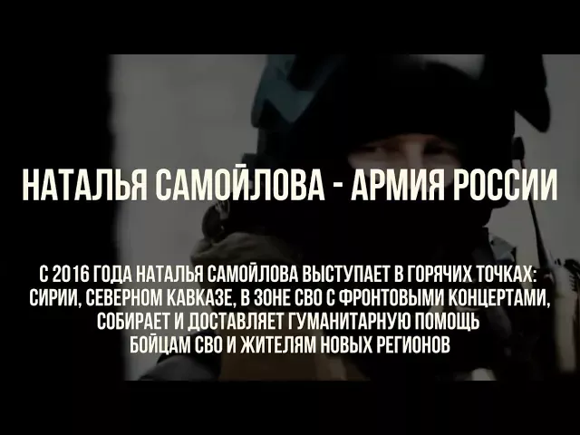 Наталья Самойлова - Армия России С 2016 года Наталья Самойлова выступает в горячих точках: Сирии, Северном Кавказе, в зоне СВО с фронтовыми концертами, собирает и доставляет гуманитарную помощь бойцам СВО и жителям новых регионов.