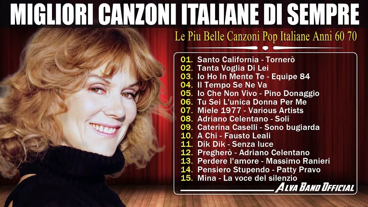 MIGLIORI CANZONI ITALIANE DI SEMPRE - MUSICA ANNI 60 - 70 | I GRANDI SUCCESSI DELLA MUSICA ITALIANA PlayList: 01. Santo California - Tornerò 02. Tanta Voglia Di Lei 03. Io Ho In Mente Te - Equipe 84 04. Il Tempo Se Ne Va 05. Io Che Non Vivo - Pino Donaggio 06. Tu Sei L'unica Donna Per Me 07. Miele 1977 - Various Artists 08. Adriano Celentano - Soli 09. Caterina Caselli - Sono bugiarda 10. A Chi - Fausto Leali 11. Dik Dik - Senza luce 12. Pregherò - Adriano Celentano 13. Perdere l'amore - Massimo Ranieri 14. Pensiero Stupendo - Patty Pravo 15. Mina - La voce del silenzio 16. In Ginocchio Da Te - Gianna Nannini 17. Mia Martini - MINUETTO 18. Bobby Solo - Zingara 19. Si è spento il sole 20. Johnny Dorelli - L'immensità ►Benvenuti nel nostro canale Alva Band Official: 🔰 Grazie per la visione! 🔰 Se ti piace: metti mi piace e condividi per i tuoi amici 🔰 Condividi le tue opinioni su questo video nella sezione commenti! ►Non eseguire il backup 🔰 Se trovi utile il mio canale. si prega di condividere. Ancora una volta grazie ragazzi. Buona giornata ❤ ❤ ❤ ✔tags: canzoni italiane, musica italiana, italian music, italian songs, canzoni italiane anni 60 70 80 90, canzoni italiane anni 70, migliori canzoni italiane di sempre, canzoni italiane famose, canzoni italiane vecchie, le più belle canzoni italiane, canzoni italiane anni 80, canzoni anni 70, musica italiana anni 80, canzoni anni 60, canzoni italiane anni 60, canzoni italiane anni 90, musica anni 60, musica italiana anni 90, anni 70, musica italiana anni 60 70 80 90 playlist, anni 80, canzoni, anni 60, il meglio della musica italiana, canzoni anni 80, musica italiana anni 60 70 80 90, musica italiana anni 70, musica italiana anni 60 70, canzoni italiane più belle del millennio, canzoni italiane anni 60 70, canzoni italiane 80, canzoni d'amore anni 60 70 80, musica anni 60 playlist, anni 90, canzoni d'amore, migliore musica italiana di tutti i tempi, italian music 70's, italian songs 70's, italienische musik, the best italian songs -------------------------------------------------------------------------