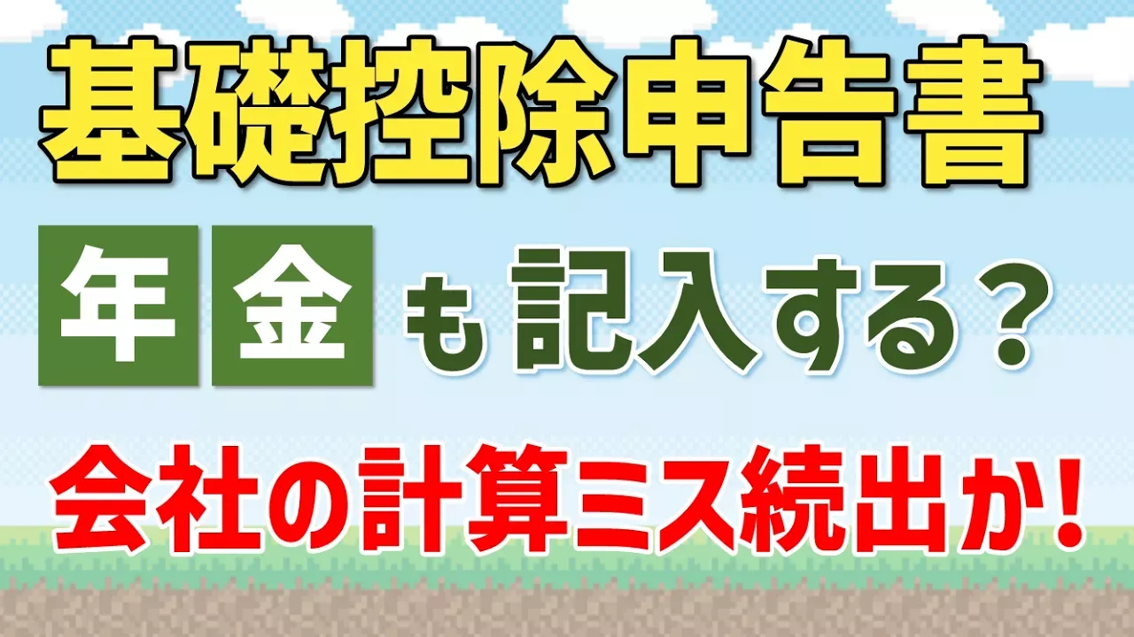 ●無料提供ツール:公的年金+給与収入の所得計算ツール https://zeimo.jp/tools/71294 基礎控除申告書に公的年金収入(雑所得)の記入が必要なのか?よくある計算ミスなど、図を使ってわかりやすく解説します。 https://www.youtube.com/watch?v=C4Q-UwWTjow https://www.youtube.com/watch?v=Tj01eSoIEQc https://www.youtube.com/watch?v=abJIia2U8yo https://www.youtube.com/watch?v=cj8zKqluec4 https://www.youtube.com/watch?v=Ka2pvoQT9Tw ----- 【目次】 00:51 今回の内容は、年末調整での年金収入の申告 02:15 年金収入を記入しないとどうなる? 04:43 給料と年金の、両方ある場合の計算方法 08:38 よくある記入ミス(計算ミス) 10:48 会社による、10万円控除、帳消しに要注意 ------ ●関連記事 2025年(令和7年)所得税・住民税改正、基礎控除・給与所得控除など https://zeimo.jp/article/69965 基礎控除申告書、公的年金収入+給料の書き方(記入例つき) https://zeimo.jp/article/72147 ●動画制作者 本動画は、ファイナンシャル・プランナー(CFP®)服部貞昭 が制作しました。 https://hattori-fp.effata.co.jp/ 【PR】 📚著書『東大卒のファイナンシャル・プランナーが教える 届け出だけでもらえるお金大全』 https://www.amazon.co.jp/%E6%9D%B1%E5%A4%A7%E5%8D%92%E3%81%AE%E3%83%95%E3%82%A1%E3%82%A4%E3%83%8A%E3%83%B3%E3%82%B7%E3%83%A3%E3%83%AB%E3%83%BB%E3%83%97%E3%83%A9%E3%83%B3%E3%83%8A%E3%83%BC%E3%81%8C%E6%95%99%E3%81%88%E3%82%8B-%E5%B1%8A%E3%81%91%E5%87%BA%E3%81%A0%E3%81%91%E3%81%A7%E3%82%82%E3%82%89%E3%81%88%E3%82%8B%E3%81%8A%E9%87%91%E5%A4%A7%E5%85%A8%E2%80%94%E2%80%94%E4%B8%80%E7%94%9F%E3%83%88%E3%82%AF%E3%81%99%E3%82%8B%EF%BC%81%E3%82%BB%E3%83%BC%E3%83%95%E3%83%86%E3%82%A3%E3%83%8D%E3%83%83%E3%83%88%E3%81%AE%E3%81%8A%E9%87%91%E4%BA%8B%E5%85%B8-%E6%9C%8D%E9%83%A8-%E8%B2%9E%E6%98%AD/dp/442613093X?dib=eyJ2IjoiMSJ9.14ADayF3012pXSy2hWCQ3A.zl3VrePcI3HgkrhWPB86sGuVgZK25kAleizpVeYka5s&dib_tag=se&language=ja_JP 下記のサイトで役立つ情報を発信しています。 🌐税金・ライフマネーの総合サイト https://zeimo.jp/