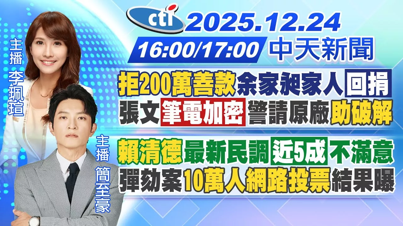 #余家昶 #捨身救人 #張善政 #家人 #大愛 #回捐 #200萬 #善款 #桃園市政府 #中壢 #仁海宮 #慰問金 #經濟狀況 #隨機殺人 #凶嫌 #張文 #筆電 #BitLocker #加密 #警方 #原廠 #協助 #暴力破解 #硬碟 #汽油彈 #動機 #華碩 #微軟 #震傳媒 #賴清德 #最新民調 #47.4% #不滿意 #43.4%滿意 #六都中 台北市 #賴清德 #彈劾案 #10萬人 #網路投票 #結果 #出爐 #61.1% #民眾 #贊成#監督的力量在中天 📣支持監督的力量,請加入中天會員👉https://reurl.cc/pgZL9d ✨專屬優惠價請輸入代碼【cti888】✨ 【迎新健康優惠】滿6288送688:https://pse.is/AR516c 【迎新保養抗老】買KS買1送1↘下殺:https://pse.is/AR522c 【迎新幫助入睡】買益生菌享順暢好眠:https://pse.is/AR518c 【迎新活力膠原】買膠原蛋白美顏行動UP:https://pse.is/AR520c 【迎新乳鐵蛋白】買膠乳鐵蛋白加強防護力:https://pse.is/AR519c 【迎新抗光抗老】KS抗光清爽高防曬凝露:https://pse.is/AR525c 【迎新入冬保濕】KS蘆薈保濕舒緩凝膠:https://pse.is/AR524c 【迎新主播桌曆】365天挺你愛的主播:https://pse.is/AR491c 【迎新主播SHOP照】主播版文創相框最給力:https://pse.is/AR513c 【迎新主播桌曆+SHOP】主播美照一次收藏:https://pse.is/AR517c 【最夯掛繩】外出手機隨身超值優惠:https://bit.ly/AR300c1 【保暖親膚】保暖落肩帽T買多優惠:https://bit.ly/AR306c 【精神滿滿】隨身咖啡錠精神超給力:https://pse.is/AR378c 【安心防護】旺旺水神專區:https://bit.ly/AR274c 【中天精神】KEEP FIGHTING中天文創:https://pse.is/AR355c 【酥脆挑豆】旺旺挑豆四款口味一次購:https://pse.is/AR323c 【絕對涮嘴】旺旺嚼代爽椒組合包:https://bit.ly/AR276c 💵線上贊助中天👉https://bit.ly/ctidonate (綠界金流/可用信用卡、ATM) 💵直接贊助中天👉彰化銀行台北分行:009-5012帳號:50128688988600戶名:中天電視股份有限公司 🏧ATM:CHANG HWA COMMERCIAL BANK TAIPEI BRANCH(CCBCTWTP501) 🏦A/C NO:50128688988600 A/C NAME:CTI TELEVISION INCORPORATION ⚠️未經著作權人同意,勿將內容用於商業性質之分享、連結。 ⚠️未經授權,嚴禁複製和用於人工智慧開發及利用。 ⚠️如有任何營業使用,必須事先取得書面同意。 【中天聊天室規範】歡迎留言互動,請尊重各自立場、理性發言,遵守本聊天室規範,違規者一經發現,將遭刪言或封鎖。〈管理員有權隨時修正規定〉 🚫禁止使用不雅、挑釁、謾罵、歧視、仇恨等言詞 🚫禁止發表危害公共安全等涉及犯罪言論 🚫禁止散布不實訊息 🚫禁止傳送鼓勵博弈訊息 🚫禁止傳送色情服務訊息 🚫禁止任何形式洗版 🚫禁止騷擾管理員與其他使用者 🎵YouTube音樂庫: https://goo.gl/Z6TsBI
