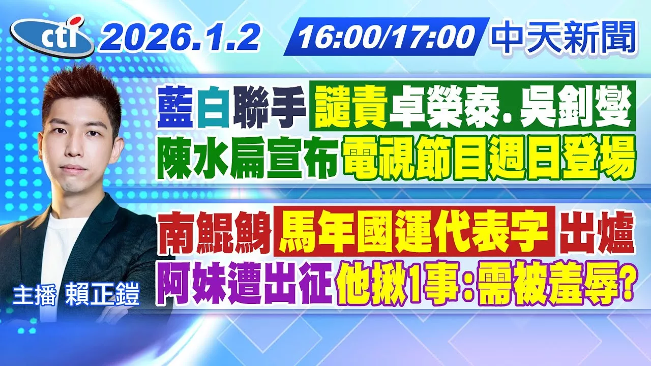 #國運 #南鯤鯓#跨年 #阿妹 #青鳥 #標案 #譴責 #卓榮泰 #吳釗燮 #柯文哲 #柯建銘 #賴清德 #馬英就 #春聯 #憲法法庭 #預算案 #監督的力量在中天 📣支持監督的力量,請加入中天會員👉https://reurl.cc/pgZL9d ✨專屬優惠價請輸入代碼【cti888】✨ 【迎新健康優惠】滿6288送688:https://pse.is/AR516c 【迎新保養抗老】買KS買1送1↘下殺:https://pse.is/AR522c 【迎新幫助入睡】買益生菌享順暢好眠:https://pse.is/AR518c 【迎新活力膠原】買膠原蛋白美顏行動UP:https://pse.is/AR520c 【迎新乳鐵蛋白】買膠乳鐵蛋白加強防護力:https://pse.is/AR519c 【迎新抗光抗老】KS抗光清爽高防曬凝露:https://pse.is/AR525c 【迎新入冬保濕】KS蘆薈保濕舒緩凝膠:https://pse.is/AR524c 【迎新主播桌曆】365天挺你愛的主播:https://pse.is/AR491c 【迎新主播SHOP照】主播版文創相框最給力:https://pse.is/AR513c 【迎新主播桌曆+SHOP】主播美照一次收藏:https://pse.is/AR517c 【最夯掛繩】外出手機隨身超值優惠:https://bit.ly/AR300c1 【保暖親膚】保暖落肩帽T買多優惠:https://bit.ly/AR306c 【精神滿滿】隨身咖啡錠精神超給力:https://pse.is/AR378c 【安心防護】旺旺水神專區:https://bit.ly/AR274c 【中天精神】KEEP FIGHTING中天文創:https://pse.is/AR355c 【酥脆挑豆】旺旺挑豆四款口味一次購:https://pse.is/AR323c 【絕對涮嘴】旺旺嚼代爽椒組合包:https://bit.ly/AR276c 💵線上贊助中天👉https://bit.ly/ctidonate (綠界金流/可用信用卡、ATM) 💵直接贊助中天👉彰化銀行台北分行:009-5012帳號:50128688988600戶名:中天電視股份有限公司 🏧ATM:CHANG HWA COMMERCIAL BANK TAIPEI BRANCH(CCBCTWTP501) 🏦A/C NO:50128688988600 A/C NAME:CTI TELEVISION INCORPORATION ⚠️未經著作權人同意,勿將內容用於商業性質之分享、連結。 ⚠️未經授權,嚴禁複製和用於人工智慧開發及利用。 ⚠️如有任何營業使用,必須事先取得書面同意。 【中天聊天室規範】歡迎留言互動,請尊重各自立場、理性發言,遵守本聊天室規範,違規者一經發現,將遭刪言或封鎖。〈管理員有權隨時修正規定〉 🚫禁止使用不雅、挑釁、謾罵、歧視、仇恨等言詞 🚫禁止發表危害公共安全等涉及犯罪言論 🚫禁止散布不實訊息 🚫禁止傳送鼓勵博弈訊息 🚫禁止傳送色情服務訊息 🚫禁止任何形式洗版 🚫禁止騷擾管理員與其他使用者 🎵YouTube音樂庫: https://goo.gl/Z6TsBI