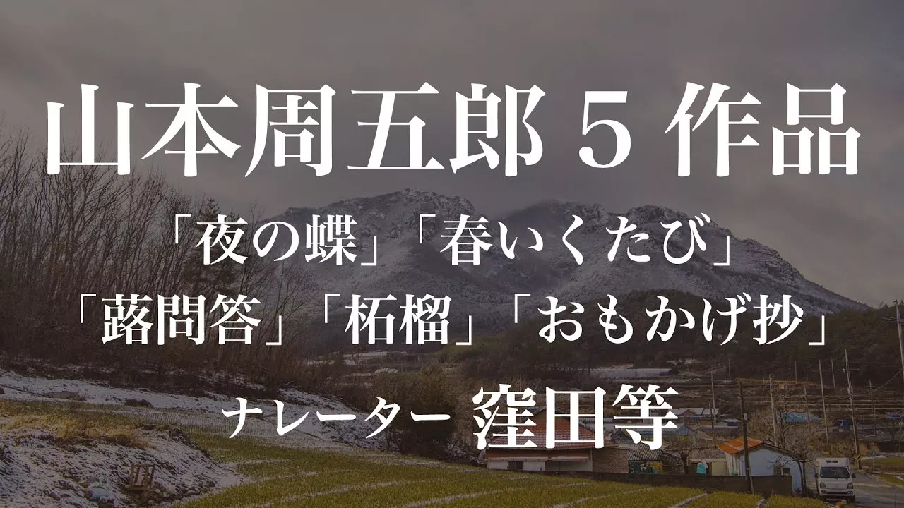 『夜の蝶』0:45〜、『春いくたび』41:12〜、『蕗問答』1:17:50〜、『柘榴』1:46:41〜、『おもかげ抄』2:34:13〜。情熱大陸のナレーション・任天堂DSのCMでお馴染みのナレーター・窪田等が、名作小説をプロフェッショナルボイスで朗読します。心落ち着く安定感ある声の朗読を、表現力のお手本、レッスン、オーディオブック、作業用、リラックス、聞き流し、ながら読書、現代文の受験勉強、表現力を身につけるために。 今週は山本周五郎作品を5つ続けてお送りします。 0:45〜 1本目は『夜の蝶』です。 41:12〜 2本目は『春いくたび』です。 1:17:50〜 3本目は『蕗問答』です。 1:46:41〜 4本目は『柘榴』です。 2:34:13〜 5本目は『おもかげ抄』です。 チャンネル登録をしていただくと、定期的に更新のご連絡が入りますので どうぞよろしくお願いいたします。 人気作品はこちら📚 太宰治『走れメロス』https://www.youtube.com/watch?v=YJe4D9JkouI%E2%80%8B%E2%80%8B%E2%80%8B 宮沢賢治『雨ニモマケズ』https://www.youtube.com/watch?v=tBYABW_ixG4%E2%80%8B%E2%80%8B%E2%80%8B 夏目漱石『夢十夜』https://www.youtube.com/watch?v=ilOQmuT8-9E%E2%80%8B%E2%80%8B%E2%80%8B 宮沢賢治『なめとこ山の熊』https://www.youtube.com/watch?v=-P3_LYSHWGU%E2%80%8B%E2%80%8B%E2%80%8B 芥川龍之介『トロッコ』https://www.youtube.com/watch?v=yMpfi8IpFF8%E2%80%8B%E2%80%8B%E2%80%8B 芥川龍之介『蜘蛛の糸』https://www.youtube.com/watch?v=suA91RlCxlU%E2%80%8B%E2%80%8B%E2%80%8B 宮沢賢治『注文の多い料理店』https://www.youtube.com/watch?v=SqP4nWI4EOs%E2%80%8B%E2%80%8B%E2%80%8B 中島敦『山月記』https://www.youtube.com/watch?v=yLgVEDplkOg 情熱大陸YouTube 窪田等編 https://www.youtube.com/watch?v=hoVtWCVMhoY%E2%80%8B%E2%80%8B%E2%80%8B%E2%80%8B%E2%80%8B%E2%80%8B%E2%80%8B%E2%80%8B