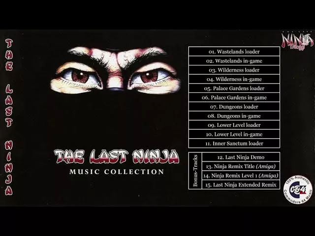 00:00 Wastelands loader – Ben Daglish 04:22 Wastelands in-game - Ben Daglish 08:21 Wildernessloader – Anthony Lees 13:13 Wildernessin-game - Ben Daglish 17:13 Palace Gardensloader - Anthony Lees 21:50 Palace Gardensin-game - Ben Daglish 26:19 Dungeonsloader - Ben Daglish 29:58 Dungeonsin-game - Anthony Lees 35:28 Lower Levelloader - Anthony Lees 39:55 Lower Levelin-game - Ben Daglish 44:05 Inner Sanctumloader - Anthony Lees Bonus-Tracks: 48:42 Last Ninja Demo - Anthony Lees 51:05 Ninja Remix Title (Amiga) – Jochen Hippel 54:36 Ninja Remix Level 1 (Amiga) – Jochen Hippel 58:35 Last Ninja Extended Remix – Instant Remedy The Last Ninja Music Collection (Soundtrack / OST)