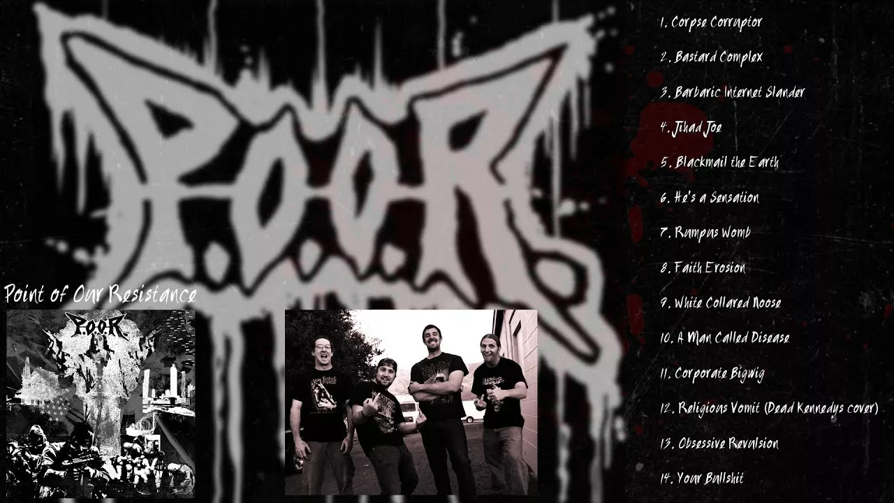 ▸ P.O.O.R's Facebook: https://www.facebook.com/unsupportedbrowser Formed in spring 2006 by Neil Burkdoll and Brad Vanderzee, they recorded a 3-song demo and then was put on hold when Neil moved to California and formed Fatalist. The band was later raised from the dead in the winter of 2010 when Brad moved to California. Reformed in Ventura, CA. P.O.O.R Features members of Fatalist, Dirty Dead, Decrypt, Stump, Burning at the Stake, Handsome Prick. Tracklist: |0:00| 1. Corpse Corruptor |1:17| 2. Bastard Complex |2:28| 3. Barbaric Internet Slander |2:33| 4. Jihad Joe |3:09| 5. Blackmail the Earth |5:27| 6. He's a Sensation |7:06| 7. Rumpus Womb |8:34| 8. Faith Erosion |10:41| 9. White Collared Noose |11:40| 10. A Man Called Disease |12:16| 11. Corporate Bigwig |12:47| 12. Religious Vomit |13:37| 13. Obsessive Revulsion |14:29| 14. Your Bullshit Band: P.O.O.R Album: ‘Point of our Resistance’ Country: U.S Type: Demo Release Date: 2012 Label: Independent Genres: Death Metal Credits: Vocals: Dylan Kuhn Guitar: Neil Burkdoll Drums: Brad Vanderzee Bass: Art Hayes For more information or requests contact: nostalgiacoremusic@gmail.com