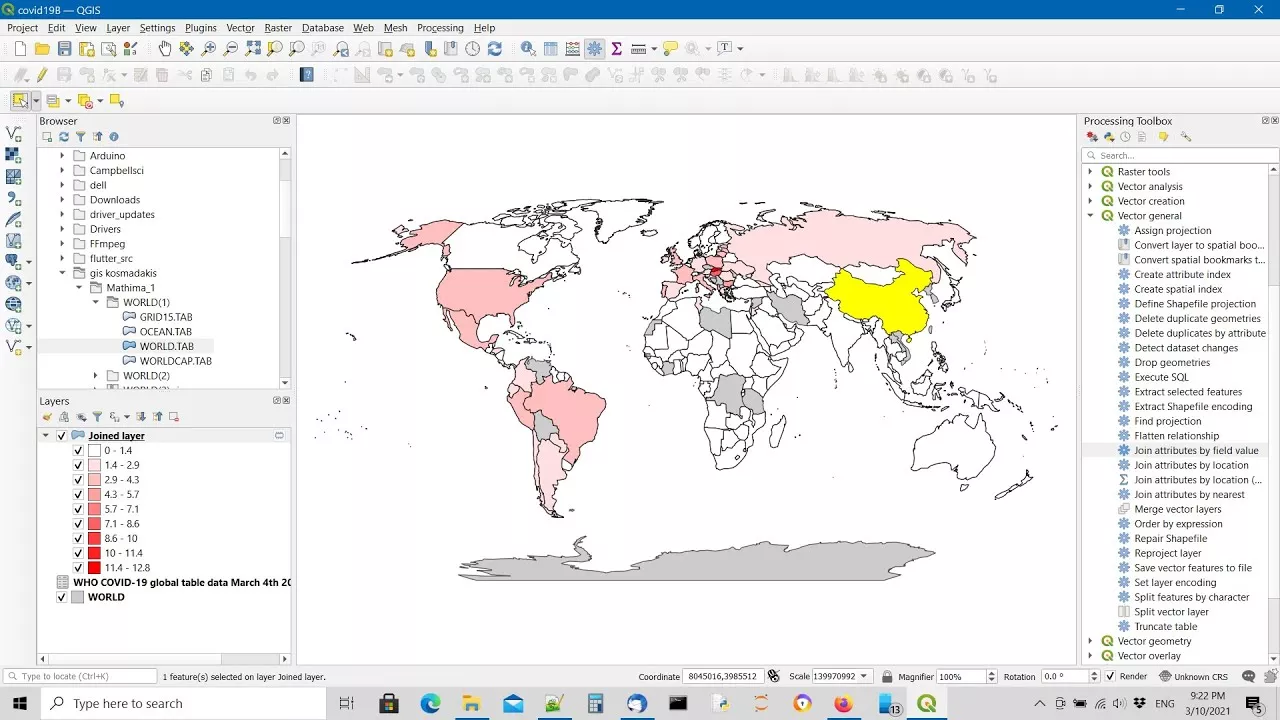 3ο Εργαστηριακό Μάθημα GIS, 4-Μαρ-2021, Τμήμα Μηχανικών Περιβάλλοντος - Δ.Π.Θ. 00:00:55 - Plugins 00:08:31 - Group Stats 00:11:45 - Υπολογισμός εμβαδού χώρας με Group Stats 00:13:59 - Υπολογισμός εμβαδού ηπείρου με Group Stats 00:15:11 - Έναρξη νέου Project 00:15:50 - Ιστότοπος του Παγκόσμιου Οργανισμού Υγείας για δεδομένα COVID19 00:20:24 - Εισαγωγή δεδομένων τύπου CSV στο πανελ επιπέδων, ως νέος Πίνακας Χαρακτηριστικών 00:24:15 - Εισαγωγή διανυσματικού επιπέδου World.tab 00:25:41 - Διασύνδεση δεδομένων του Πινακα COVID19 με τον παγκόσμιο χάρτη 00:27:05 - Join attributes by field value 1 00:31:40 - Join attributes by field value 2 00:33:10 - Χρωματική διαβάθμιση σύμφωνα με τον αριθμό των κρουσμάτων covid