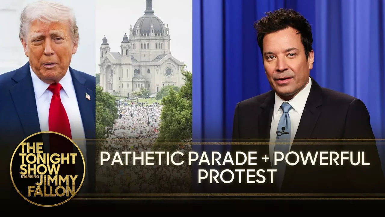Jimmy addresses the latest news, like the Trump Organization unveiling a new mobile phone service, Trump attending the G7 summit in Canada and nationwide "No Kings" protests drawing major crowds throughout the United States. The Tonight Show Starring Jimmy Fallon. Stream now on Peacock: https://www.peacocktv.com/unavailable Subscribe NOW to The Tonight Show Starring Jimmy Fallon: https://www.youtube.com/channel/UC8-Th83bH_thdKZDJCrn88g?sub_confirmation=1 Watch The Tonight Show Starring Jimmy Fallon Weeknights 11:35ET/10:35c Get more The Tonight Show Starring Jimmy Fallon: https://www.nbc.com/the-tonight-show JIMMY FALLON ON SOCIAL Follow Jimmy: http://Twitter.com/JimmyFallon Like Jimmy: https://www.facebook.com/unsupportedbrowser Follow Jimmy: https://www.facebook.com/unsupportedbrowser Follow Jimmy on Threads: https://www.facebook.com/unsupportedbrowser Follow Jimmy on TikTok: https://www.tiktok.com/@jimmyfallon THE TONIGHT SHOW ON SOCIAL Follow The Tonight Show: http://Twitter.com/FallonTonight Like The Tonight Show: https://www.facebook.com/unsupportedbrowser Follow The Tonight Show: https://www.facebook.com/unsupportedbrowser Follow The Tonight Show on Threads: https://www.facebook.com/unsupportedbrowser The Tonight Show TikTok: https://www.tiktok.com/@fallontonight The Tonight Show Starring Jimmy Fallon features hilarious highlights from the show, including comedy sketches, music parodies, celebrity interviews, ridiculous games, and, of course, Jimmy's Thank You Notes and hashtags! You'll also find behind the scenes videos and other great web exclusives. GET MORE NBC NBC YouTube: https://www.youtube.com/nbc Like NBC: https://www.facebook.com/unsupportedbrowser Follow NBC: http://Twitter.com/NBC NBC Instagram: https://www.facebook.com/unsupportedbrowser Trump's Pathetic Military Parade Squeaks Past Empty Seats as No Kings Protests Draw Historic Crowds https://www.youtube.com/fallontonight