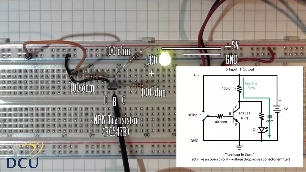 This video demonstrates the use of a single transistor to implement a NOT gate (inverter). This is one of the first circuits in the EE223 Introduction to Digital and Analogue electronics module at Dublin City University. The associated materials are at: http://www.eeng.dcu.ie/~molloyd/EE223/