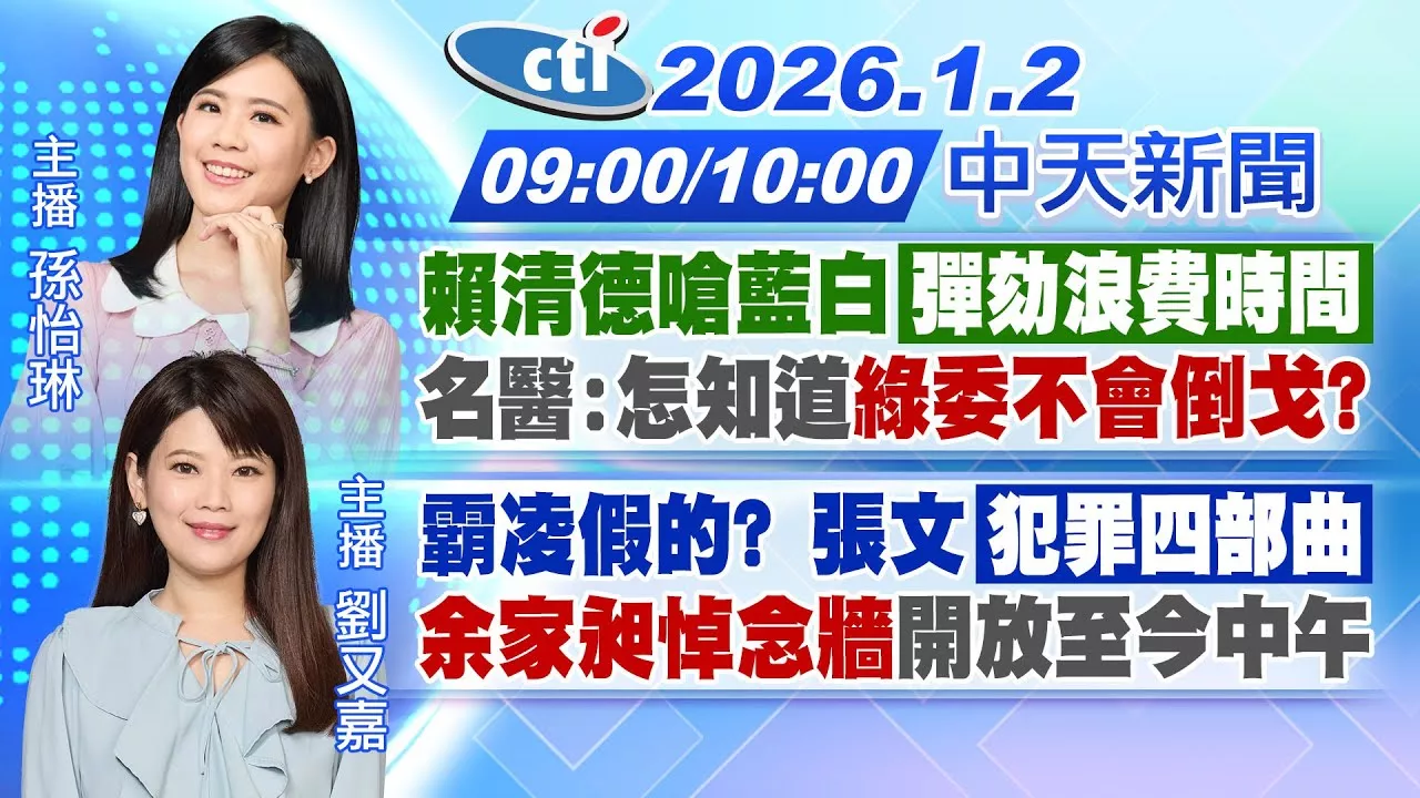 #2026元旦 #管碧玲 #軍演 #賴清德 #卓榮泰 #韓國瑜 #鄭麗文 #彈劾賴清德 #憲法法庭 #2026地方選舉 #兩岸 #川普 #張文 #余家昶 #AOA權娥 #王夢麟酒駕 #瑞士酒吧爆炸 #監督的力量在中天 📣支持監督的力量,請加入中天會員👉https://reurl.cc/pgZL9d ✨專屬優惠價請輸入代碼【cti888】✨ 【迎新健康優惠】滿6288送688:https://pse.is/AR516c 【迎新保養抗老】買KS買1送1↘下殺:https://pse.is/AR522c 【迎新幫助入睡】買益生菌享順暢好眠:https://pse.is/AR518c 【迎新活力膠原】買膠原蛋白美顏行動UP:https://pse.is/AR520c 【迎新乳鐵蛋白】買膠乳鐵蛋白加強防護力:https://pse.is/AR519c 【迎新抗光抗老】KS抗光清爽高防曬凝露:https://pse.is/AR525c 【迎新入冬保濕】KS蘆薈保濕舒緩凝膠:https://pse.is/AR524c 【迎新主播桌曆】365天挺你愛的主播:https://pse.is/AR491c 【迎新主播SHOP照】主播版文創相框最給力:https://pse.is/AR513c 【迎新主播桌曆+SHOP】主播美照一次收藏:https://pse.is/AR517c 【最夯掛繩】外出手機隨身超值優惠:https://bit.ly/AR300c1 【保暖親膚】保暖落肩帽T買多優惠:https://bit.ly/AR306c 【精神滿滿】隨身咖啡錠精神超給力:https://pse.is/AR378c 【安心防護】旺旺水神專區:https://bit.ly/AR274c 【中天精神】KEEP FIGHTING中天文創:https://pse.is/AR355c 【酥脆挑豆】旺旺挑豆四款口味一次購:https://pse.is/AR323c 【絕對涮嘴】旺旺嚼代爽椒組合包:https://bit.ly/AR276c 💵線上贊助中天👉https://bit.ly/ctidonate (綠界金流/可用信用卡、ATM) 💵直接贊助中天👉彰化銀行台北分行:009-5012帳號:50128688988600戶名:中天電視股份有限公司 🏧ATM:CHANG HWA COMMERCIAL BANK TAIPEI BRANCH(CCBCTWTP501) 🏦A/C NO:50128688988600 A/C NAME:CTI TELEVISION INCORPORATION ⚠️未經著作權人同意,勿將內容用於商業性質之分享、連結。 ⚠️未經授權,嚴禁複製和用於人工智慧開發及利用。 ⚠️如有任何營業使用,必須事先取得書面同意。 【中天聊天室規範】歡迎留言互動,請尊重各自立場、理性發言,遵守本聊天室規範,違規者一經發現,將遭刪言或封鎖。〈管理員有權隨時修正規定〉 🚫禁止使用不雅、挑釁、謾罵、歧視、仇恨等言詞 🚫禁止發表危害公共安全等涉及犯罪言論 🚫禁止散布不實訊息 🚫禁止傳送鼓勵博弈訊息 🚫禁止傳送色情服務訊息 🚫禁止任何形式洗版 🚫禁止騷擾管理員與其他使用者 🎵YouTube音樂庫: https://goo.gl/Z6TsBI