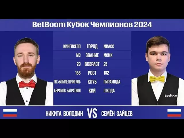@"BetBoom Кубок Чемпионов 2024".Н.Володин (RUS) - С.Зайцев (RUS) Свободная пирамида. 25 июля прямой эфир на Матч ТВ в 21.30 Матчи проходят в Экспоцентре на Красной Пресне. Москва Хотите увидеть матчи живьем? Вход свободный - пишите info@billiard.su ! Количество мест ограничено. Информация о турнире, турнирная сетка, расписание встреч: https://bill4you.ru/rus-billiard/tournament/3347 Архивы видео и фотоматериалов в ТГ: https://t.me/BilliardsforMatchTV Смотри "BetBoom Кубок Чемпионов 2024" и получи бонус до 3000 на первый депозит! Ссылка с бонусом: https://clck.ru/pSP5A BetBoom соцсети: Instagram — https://clck.ru/pSPiZ VK — https://clck.ru/pSPzN Twitter — https://clck.ru/pSQon FB — https://clck.ru/pSQyQ