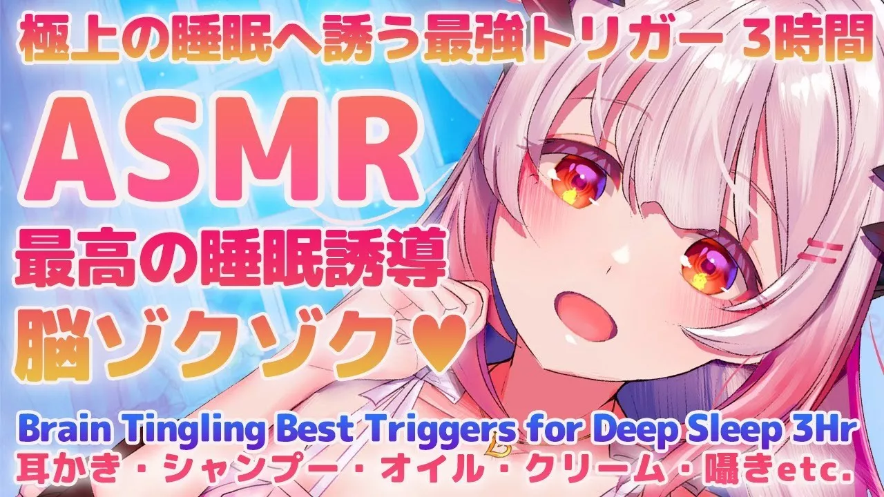 眠れない夜は不安だと思うので 優しい言葉、囁きと癒し中心の配信になっております。 理由はないけど寝付けないそんな方もぜひおすすめです。 タイムスタンプれいんさんからお借りしました。 0:00:00【耳を触る / Ear Touching】 耳を触る,囁き 0:00:40【シリコンパフ / Silicone Puff】 耳にシリコンパフ,囁き,オノマトペ,「ふー」 0:02:30【クッションペーパー / Honeycomb Paper Wrap】 クッションペーパー越しの指耳かき,囁き,オノマトペ 0:03:46【炭酸水の水中音 / Underwater Sounds of Sparkling Water】 [Binaural 1] 炭酸水のボトルの音,炭酸水を注ぐ,囁き [Stereo] 炭酸水を注ぐ,炭酸の弾ける音,炭酸水を追加,しゅわしゅわが強く [Binaural 2] 炭酸水の水中音 0:09:35【ふわふわタオル / Fluffy Towel】 耳にふわふわタオル,囁き,オノマトペ,ふわふわタオル越しの指耳かき 0:11:08【ふわふわスポンジ / Soft Sponge】 耳にふわふわスポンジ,囁き,オノマトペ,両耳にぎゅっとしたり放したり,「ふー」 0:13:32【もふもふ尻尾 / Fluffy Tail】 耳にもふもふ尻尾,囁き,オノマトペ,「ふー」 0:15:44【耳のマッサージ1 / Ear Massage 1 (Lavender Cream)】 マッサージクリーム(ラベンダー)の容器の音,クリームを手で伸ばす,囁き,オノマトペ,耳のクリームマッサージ,「ふー」,耳の後ろ,クリームを追加,耳を覆いながら,耳のツボ押し,「はー」,耳餃子の上からぐにぐに,耳餃子で耳を塞ぐ,ぺたぺた,耳の縁 0:30:24【耳のマッサージ2-1 / Ear Massage 2-1 (Foam)】 泡スプレーの容器の音,ボウルに泡を,ボウルとブラシで更に泡立てる,泡を耳元でにぎにぎ,囁き,オノマトペ,耳の泡マッサージ,泡を追加,ぺたぺた,お顔にも 0:34:57【あわあわスポンジ / Foam & Sponge】 [Binaural] 囁き,オノマトペ,「ふー」 [Stereo] あわあわスポンジをにぎにぎ,スポンジの表面をカリカリ 0:38:01【耳のマッサージ2-2 / Ear Massage 2-2 (Foam)】 耳の泡マッサージの続き,囁き,オノマトペ,耳の後ろ,お顔にも,ぺたぺた,耳を包み込みながら,「ふー」 0:43:50【耳を拭く / Ear Wiping (Fluffy Towel, Cotton Swab, Facial Tissue, Another Fluffy Towel)】 桶のお湯で手を洗う,ふわふわタオルで手を拭く,お顔を拭く,綿棒で耳の隙間の泡を拭き取る,ふわふわタオルで耳を拭く,囁き,オノマトペ,残った泡をティッシュで拭く,新しいふわふわタオルで,綿棒でもう一度 0:48:22【ジェルボール / Gel Ball】 耳にジェルボール,囁き,オノマトペ,「ふー」 0:50:37【ブラシ状のゴム耳かき / Brush Type Rubber Ear Pick】 耳にブラシ状のゴム耳かき,囁き,オノマトペ 0:52:36【竹の耳かきと梵天 / Japanese Bamboo Ear Pick & Down Puff】 竹の耳かき,囁き,オノマトペ,ふわふわ梵天,「ふー」 0:55:30【コルクボード / Cork Board】 コルクボードをタッピング 0:56:28【シャンプー / Shampoo】 首にタオルを巻く,囁き,なでなで,耳を触る,桶のお湯でスポンジを濡らす,スポンジで髪を濡らす,シャンプーボトル(オイル入り)の音,髪に泡を,シャンプーする,オノマトペ,頭頂部,シャカシャカと,後頭部,側頭部,揉み込むように,指先でぎゅっとして離す,指先でとんとん,細かくシャカシャカと,耳の後ろの後頭部,ツボ押し,「ふー」,首の後ろの後頭部,泡を追加,髪をまとめる 1:16:43【お湯とタオル / Hot Water & Fluffy Towel】 桶のお湯の音,髪を濡らす,ふわふわタオルで髪を拭く,囁き,オノマトペ 1:19:35【耳にブラシ / Ear Brushing】 耳にブラシ,囁き,オノマトペ,「ふー」 1:21:17【こんにゃくスポンジ / Konjac Sponge】 耳にこんにゃくスポンジ,囁き,オノマトペ,スポンジの表面をカリカリ,耳のまわりでにぎにぎ,「ふー」 1:25:30【ふわふわスポンジ / Soft Sponge】 耳にふわふわスポンジ,囁き,オノマトペ 1:28:17【綿棒 / Cotton Swab】 綿棒の容器の音,綿棒(左耳),囁き,オノマトペ,「ふー」,耳を触る,綿棒(右耳) 1:33:36【タオル越しの指耳かき / Towel-covered Finger】 ちくちくタオル越しの指耳かき,囁き,オノマトペ 1:35:05【イヤーカバー / Ear Cover】 耳にイヤーカバー,イヤーカバー越しに耳を触る,囁き,オノマトペ 1:37:50【お耳にパック / Gel Sheet for Ears】 タッピング,耳を触る,容器の音,耳にパック 1:41:17【耳のマッサージ3-1 / Ear Massage 3-1 (Vitamin C Cream)】 マッサージクリーム(ビタミンC)の容器の音,クリームを手で伸ばす,耳のクリームマッサージ,囁き,オノマトペ,「ふー」,耳の後ろ,耳を覆いながら,耳を塞ぎながらぐにぐに 1:49:58【耳のマッサージ3-2 / Ear Massage 3-2 (Firm Gel Ball & Cream)】 耳の内側に硬めのジェルボール,囁き,オノマトペ 1:53:28【耳のマッサージ3-3 / Ear Massage 3-3 (Vitamin C Cream)】 「ふー」,耳のクリームマッサージの続き,手のひらで耳をぎゅー,タッピング 1:54:48【スポンジ / Sponge】 耳にスポンジ,囁き,オノマトペ 1:56:14【耳にブラシ / Ear Brushing】 耳にブラシ,囁き,オノマトペ,「ふー」,耳を触る 1:57:27【耳のマッサージ4 / Ear Massage 4 (Orange & Lavender Oil)】 マッサージオイル(オレンジ,ラベンダー)の容器の音,オイルを手で伸ばす,耳のオイルマッサージ,囁き,オノマトペ,「ふー」,耳を覆いながら,耳の後ろ,耳餃子の上からぐにぐに,耳餃子で耳を塞ぐ,タッピング 2:06:47【水のボトル / Watter Bottle】 水のボトルの音,囁き