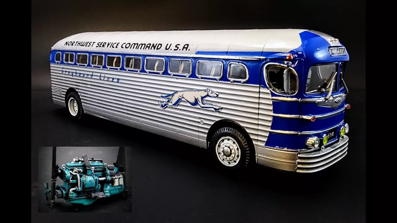 https://www.modelroundup.com/1947-GMC-PD3751-Silverside-Greyhound-Bus-p/roden-816.htm Roden 816 PD-3751 'Silversides' - an intercity bus created in the mid-1930s by Yellow Coach for one of the largest coach companies, Greyhound Lines. The bus was a real revolution in automobile construction; corrugated aluminum and plastic materials were widely used in its structure, and special attention was paid to maximum comfort for passengers because after the construction of a wide network of high-quality highways between all the cities of the country during the Great Depression, rail passenger traffic almost stopped due to its inability to compete with high-speed road transport. Mass production has been going on since 1939 at the Pontiac West Assembly plant in Pontiac, Michigan, where General Motors used to build pickups and trucks. With the entry of the United States into World War II, the mass transportation of recruits at assembly points, and by the military in all countries, presented a major challenge, and to solve this problem the US decided to use the Greyhound Lines buses. As early as 1942, they carried more than 130 million passengers, both military and civilian, more than just an impressive figure, as it accounted for almost half of the country's population. After the war, Silversides continued to conduct passenger traffic within the country, and some of them were resold to third countries, mainly in Latin America. This bus is one of the symbols of the United States, along with Ford cars and Boeing aircraft, and embodies the significant technological progress that made this country great in the first half of the twentieth century. This GM bus revolutionized the industry, and set the template for all over-the road buses to come: forward control, rear transverse diesel engine, the famous fluted aluminum “Silversides” cladding, semi-monocoque construction, high floor and underfloor luggage compartments. But its wildest feature was not replicated: a four-on-the-tree shifter and its mechanical linkage back to the non-synchronized gear box; something had to be left to improve. Let’s check it out and delve into the history and workings of its legendary Detroit Diesel 6-71 engine, which first made its appearance here. GM’s two-stroke Detroit Diesel (“DD”) engine is one of America’s engineering marvels of the twentieth century. Designed under the direction of Charles Kettering at the GM Advanced Labs, the two-stroke principle was used in part because of the desire to have a compact and light engine for use in GM’s coaches, which dominated the industry, or would very soon. Many of you already know its operating principles, but for the uninitiated, they’re worth repeating again. The DD is different from the typical loop-scavenged two-stroke engine, which has no valves and relies strictly on ports (openings) in the cylinder for the intake and exhaust, as well as crankcase pressure to help keep the gases flowing (typically, but not always). The DD two-stroke “Uniflow” has port openings in the cylinders for the intake air, but has two or four exhaust valves in each cylinder’s head. In order to fill the cylinder with fresh air since there’s no intake stroke, a blower is essential for its operation. Here’s a short video showing the DD two stroke cycle. The DD engine family was designed from scratch to be modular, to be built in many cylinder multiples. The “71” indicates the cubic inch displacement per cylinder; therefor this 6-71 has 426 CID. Two, three and four cylinder versions were offered from the beginning for powering everything from smaller trucks, gen-sets, pumps, tractors, marine use, and a host of other applications where its small size and durability put it to great advantage. Later, larger multiples were also built, including V8, V12, V16 and according to one source, even a V24. The smaller 53 family soon joined, and in more recent years, a 92 family largely replaced the 71 series. But the 71 family lasted into the 1990’s, and millions of these engines are still at work in all manner of vehicles, boats and equipment. The same basic two stroke diesel design was also scaled up and used in diesel locomotives, where GM enjoyed a near monopoly for decades.
