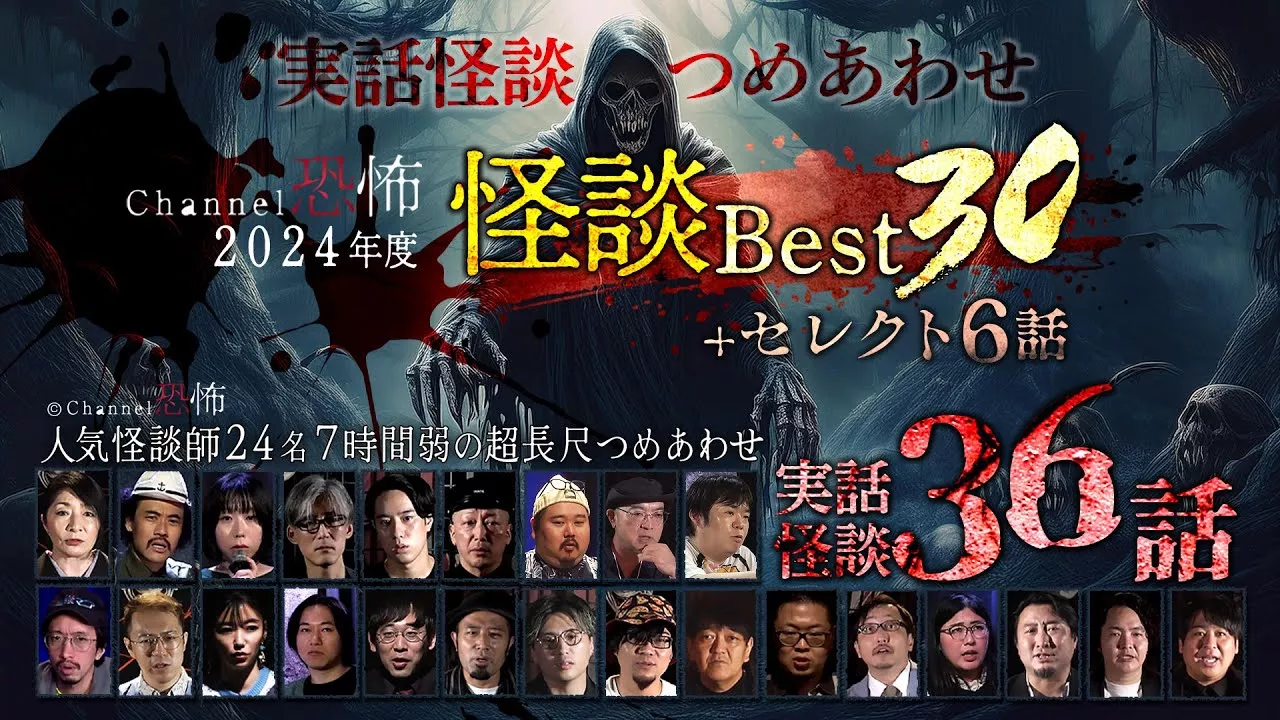 2024年度の年間ベスト30にセレクト6話をプラスした特別編! 2026年1月1日から公開される2025年度ベスト30の前にもう一度、前年度のベスト30をおさらい! 「2020~2021年度の怪談ベスト30」 https://youtu.be/gPWyUayDxOk 「2022年度怪談ベスト30+5」 https://youtu.be/bobcVOqIXlk 「2023年度怪談ベスト30+6」 https://youtu.be/pKpXbEV44oc ※2024年度怪談ベスト30を「ベスト30~21位」「ベスト20~11位」「ベスト10~1位」に分けて配信していた動画を1本にまとめ、惜しくも選外となった中からセレクトした6話を追加した動画です。 ※収録されている怪談の順位は視聴回数、アンケート結果などに基づいて導き出されたもので、決して怪談の優劣に順位をつけたものではございませんので、ご理解ください。 【収録怪談】 00:00:00 オープニング 00:00:12 セレクト①「伊藤さん」村上ロック 00:14:06 セレクト②「人面犬」伊山亮吉 ※広告が入ります 00:25:36 第30位「甘い香りの女」夜馬裕 00:44:51 第29位「心中事件」ガンジー横須賀 00:53:01 第28位「霊感」チビル松村(チビルマ) ※広告が入ります 01:04:06 第27位「剥がせない御札」響洋平 01:19:05 第26位「トンネルの午前3時」川奈まり子 01:32:35 第25位「トイレの先客/霊道のある部屋」シークエンスはやとも ※広告が入ります 01:38:51 第24位「おばあちゃん」ぁみ 01:48:00 第23位「間違い電話」深津さくら 01:51:20 第22位「罪ほろぼし」村上ロック ※広告が入ります 01:57:59 第21位「庭の家族」夜馬裕 02:11:02 セレクト③「深海の歌」住倉カオス 02:23:03 セレクト④「誰もいない学校」ぁみ ※広告が入ります 02:31:26 第20位「燃える家」クダマツヒロシ 02:48:14 第19位「ヤマモトリコ」吉田悠軌 02:57:48 第18位「消失」うえまつそう ※広告が入ります 03:03:18 第17位「奈良の廃マンション」宮代あきら 03:13:53 第16位「くる」若本衣織 03:23:47 第15位「一番の親友」夜馬裕 ※広告が入ります 03:29:07 第14位「下が怖い」匠平 03:40:10 第13位「ひとりかくれんぼ」伊山亮吉 03:56:40 第12位「動かないCA」夜馬裕 ※広告が入ります 04:05:48 第11位「添乗員」西浦和也 04:21:29 セレクト⑤「白い箱」吉田猛々(ナナフシギ) 04:34:22 セレクト⑥「眠り歌」ヤースー ※広告が入ります 04:43:02 第10位「犬憑き」田中俊行 04:51:24 第9位「おしぼり屋のタブー」匠平 05:01:45 第8位「整形手術」ハニトラ梅木 ※広告が入ります 05:13:50 第7位「祖母の財布」響洋平 05:32:48 第6位「お兄ちゃん」松嶋初音 05:37:56 第5位「ダム」はやせやすひろ(都市ボーイズ) ※広告が入ります 05:46:48 第4位「十物語」うえまつそう 06:00:16 第3位「ばんもんの部屋」夜馬裕 06:22:14 第2位「忘れ物」夜馬裕 ※広告が入ります 06:42:51 第1位「元カノ」松嶋初音 これらの怪談は・・・ ひとつの怪談から連鎖していく《連鎖怪談》・・・ 『住倉カオスの怪談☆語ルシス』と、怪談独り語り『怪談鬼』シリーズ、生配信『DJ響の怪談に酔いしれる夜』『夜馬裕のスジなし怪談』、公開イベント『DJ響の怪談に酔いしれる宴』、生配信『裏怪談』『怪対談』『継承怪談』等からの抜粋です。 全編を視聴したい方は、メンバーシップ加入またはリンク先(概要後半)へ・・・ 《全編視聴するなら『Channel恐怖』で主に3通りの視聴方法!》 ※それぞれ番組編成が異なります。詳細は http://ch-kyofu.com/ ★YouTube Channel恐怖メンバーシップ加入 月額590円で有料コンテンツ含む全番組見放題&限定動画視聴&カスタム絵文字使用可 ※iphoneアプリからの加入の場合、手数料が上乗せされますのでご注意下さい。 Androidアプリ又はPC又はWebブラウザからの加入であれば、手数料はかかりません。 ★amazon prime video チャンネル (https://www.amazon.co.jp/channels/chkyofu) ★ニコニコチャンネル (https://ch.nicovideo.jp/kyofu) ★その他、U-NEXT、Huluなどでも配信中! ◎このYouTubeチャンネルでは生配信の他、月、水、金、土の 週4回~ペースでオリジナル・オカルトコンテンツを更新中! 作業用、睡眠用にも最適な2時間以上の長尺怪談つめあわせも多数配信中! ◎Cnannel恐怖X @ch_kyofu ****注意事項**** 当チャンネル内の全てのコンテンツ、サムネ、画像、文字情報等の著作権はChannel恐怖(リーレ株式会社)が有します。 一切の無断転載、コピー、ダウンロード、及び映像、音声の2次利用を禁じます。 ****WARNING**** Channel Koufu (Rile Co., Ltd.) owns the copyright of all contents, thumbnails, images, text information, etc. in this channel. Please note that all rights reserved. #怪談 #怖い話 #つめあわせ