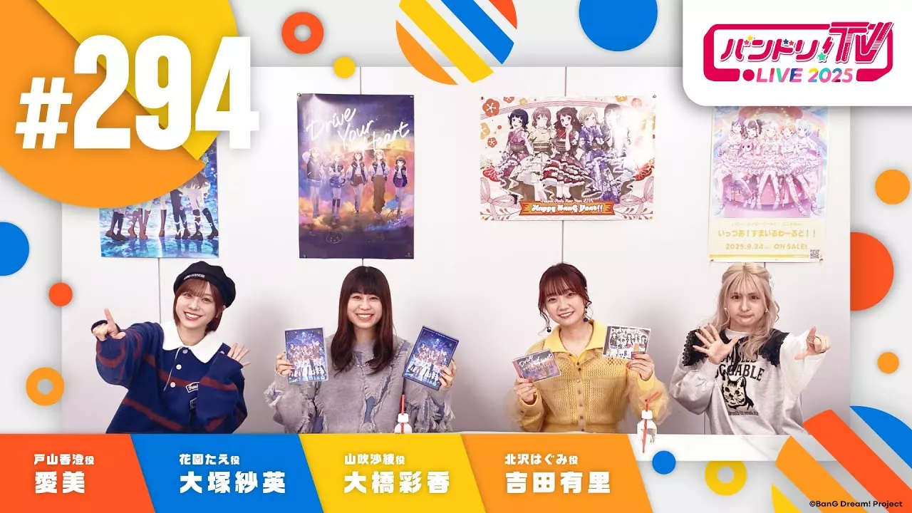 バンドリ!プロジェクトに関する最新情報などをお届けする「バンドリ!TV LIVE 2025」!! 毎週木曜日は、22:00よりYouTube「バンドリちゃんねる☆」にてミニアニメ「元祖!バンドリちゃん」を配信し、続いて22:03頃~「バンドリ!TV LIVE 2025」をお届けします! さらに番組終了後の23:00からは、TOKYO MXほかにてアニメ「BanG Dream! 3rd Season」を再放送!23:25頃よりTOKYO MXにてミニアニメ「元祖!バンドリちゃん」の地上波放送もございます♪ ぜひあわせてご覧ください♪ ※出演キャスト、及びスタッフの安全面に十分配慮した上で実施いたします。 ■「バンドリ!TV LIVE 2025」#294 出演 愛美(戸山香澄 役) 大塚紗英(花園たえ 役) 大橋彩香(山吹沙綾 役) 吉田有里(北沢はぐみ 役) ☆バンドリ! 公式サイト:https://bang-dream.com/ 公式X:https://twitter.com/bang_dream_info ☆スマートフォン向けゲーム『バンドリ! ガールズバンドパーティ!』 iOS: https://goo.gl/NVSIlf Android: https://goo.gl/xKdZmk 公式サイト:https://bang-dream.bushimo.jp/ 公式X:https://twitter.com/bang_dream_gbp ★★★★★★★★★★★★★★★★★★★
