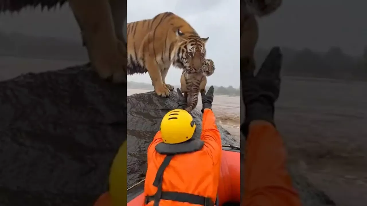 홍수에 갇힌 호랑이 모녀 😭 거대한 홍수 거친 물살 속 바위 하나 호랑이 엄마가 새끼를 입에 물고 바위 위에 갇혀있었어요 구조 보트가 접근하자 엄마는 조심스럽게 입을 열고 새끼를 먼저 건네줬어요 구조대가 새끼를 받아 안전하게 보호 그제야 엄마 호랑이도 보트로 뛰어올랐어요 둘 다 무사히 구조 💚 신뢰와 모성애 종을 초월한 순간 📍 감동받으셨다면 👍 좋아요 💬 "둘 다 살아서 다행" 🔔 구독 Tigers trapped in massive flood 😭 Huge flood Violent currents One rock Mother tiger holding cub in mouth Stranded on rock Rescue boat approached Mother carefully opened jaws Handed cub to rescuers first Crew secured cub safely Then mother jumped to boat Both rescued 💚 Trust and maternal love Beyond species 📍 If this moved you 👍 Like 💬 "Glad they're safe" 🔔 Subscribe