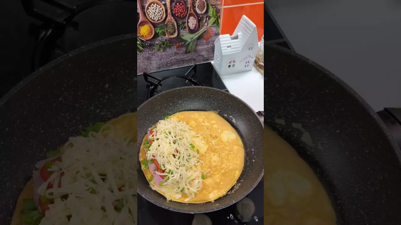 Збийте два яйця до однорідності й вилийте на гарячу сковорідку. Одразу щедро присипте омлет тертим сиром. Покладіть зверху лаваш і обережно переверніть на інший бік. Знову додайте трішки сиру, викладіть ароматну шинку, соковитий помідор та пір’ячко зеленої цибулі. Завершіть ще однією дрібкою сиру й акуратно складіть лаваш навпіл. Виходить гаряча, тягуча й дуже смачна закуска, від якої неможливо відірватися! #швидкийсніданок #сніданокза5хвилин #лавашзначинкою #омлетулаваші #легкийрецепт #простотакасмачність #домашнірецепти #ідеядлясніданку #смачноішвидко #лаваш #стравизлаваша #quickbreakfast #5minbreakfast #easyrecipe #tastyeasyquick