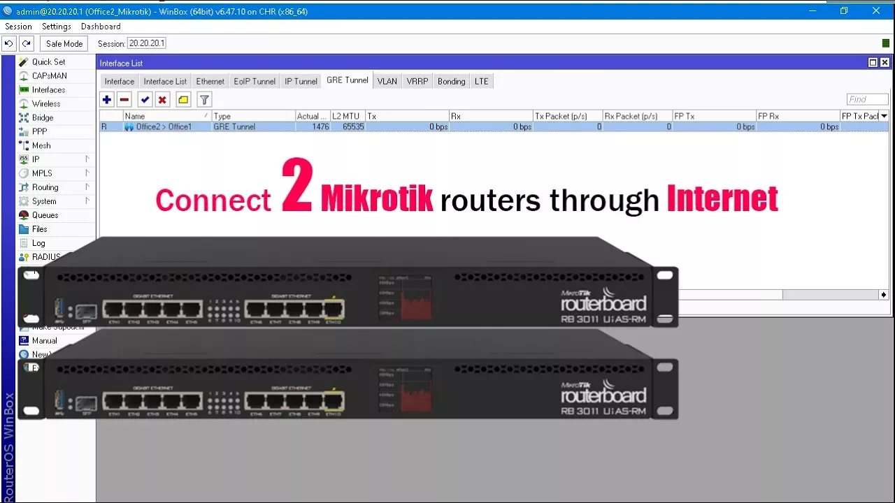 In this video you will learn how to connect two mikrotik routers over internet so that computers can connect others through internet - GRE Tunnel Configuration - Assigning IP Address in GRE Tunnel Interface - Static Route Configuration Thanks for watching, don't forget like and subscribe at https://goo.gl/LoatZE