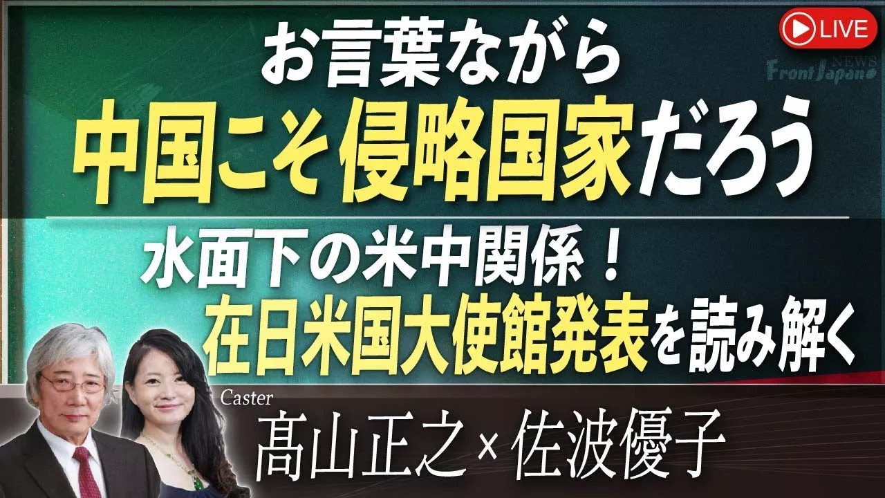 気鋭のキャスター陣が、ますます混迷を深める日本の現状や国際情勢を読み解くべく、日本最前線(Front Japan)の気概で、日々のニュースや時事のほか、様々なテーマについて取り上げ、日本が進むべき正道を追求します! キャスター:髙山正之・佐波優子 ■ ニュースPick Up ■ お言葉ながら中国こそ侵略国家だろう ■ 水面下の米中関係!在日米国大使館発表を読み解く ◆チャンネル桜の人気番組「闘論!倒論!討論!」支援会員募集! 「がんばれ!『闘論!倒論!討論!』」会員 お申し込みはこちらから http://www.ch-sakura.jp/1636.html ◆ウイグル「ジェノサイド」国会議員アンケート・集計結果 http://www.ch-sakura.jp/1633.html ◆有料番組 ch桜大学開校! https://sakura-daigaku.jp/ ◆チャンネル桜・別館 https://www.youtube.com/channel/UCGbSDhzR4hbRAmSuRK-z_ng ※チャンネル桜では、自由且つ独立不羈の放送を守るため、『日本文化チャンネル桜二千人委員会』の会員を募集しております。以下のページでご案内申し上げておりますので、全国草莽の皆様のご理解、ご協力を、何卒宜しくお願い申し上げます。 http://www.ch-sakura.jp/579.html ◆チャンネル桜公式HP http://www.ch-sakura.jp/