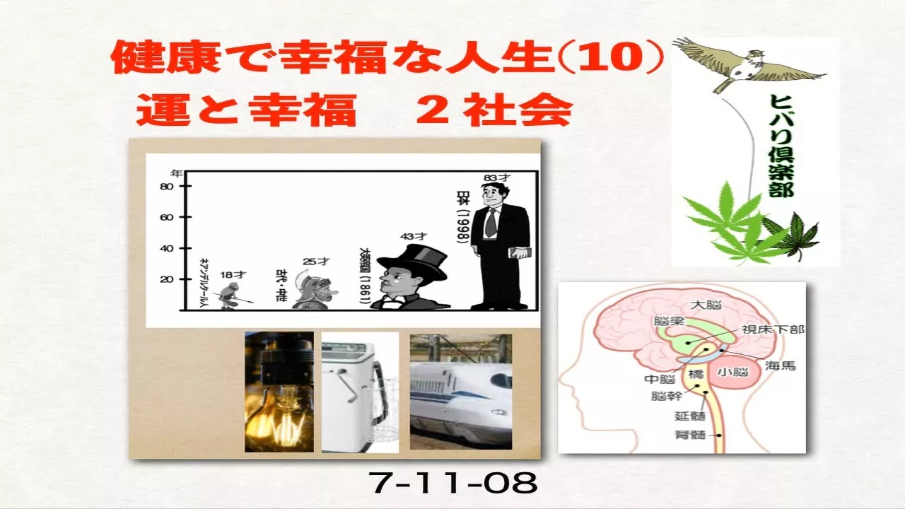 【健康で幸福な人生(10)「運と幸福(2)社会」】 人間の「運」とは、 努力や信仰ではなく.. この宇宙に存在する.. “分布”の一部にすぎない どの時代に生まれるか? どんな文明に出会うか? それ自体が、 幸福と健康を左右する 照明・洗濯機・新幹線が、 実は人類の寿命を 400年に伸ばした そして今、 NHKの「情報」が、 私たちの脳を左右している 幸福を守るために.. 「見る情報」 を選び取ろう